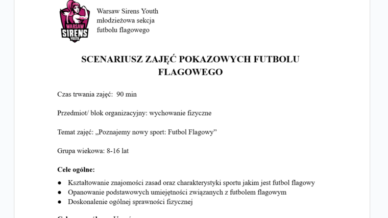 - zajęcia prowadzone przez doświadczonych trenerów i zawodniczki Reprezentacji Polski w futbolu flagowym